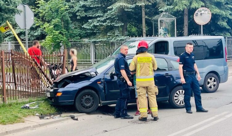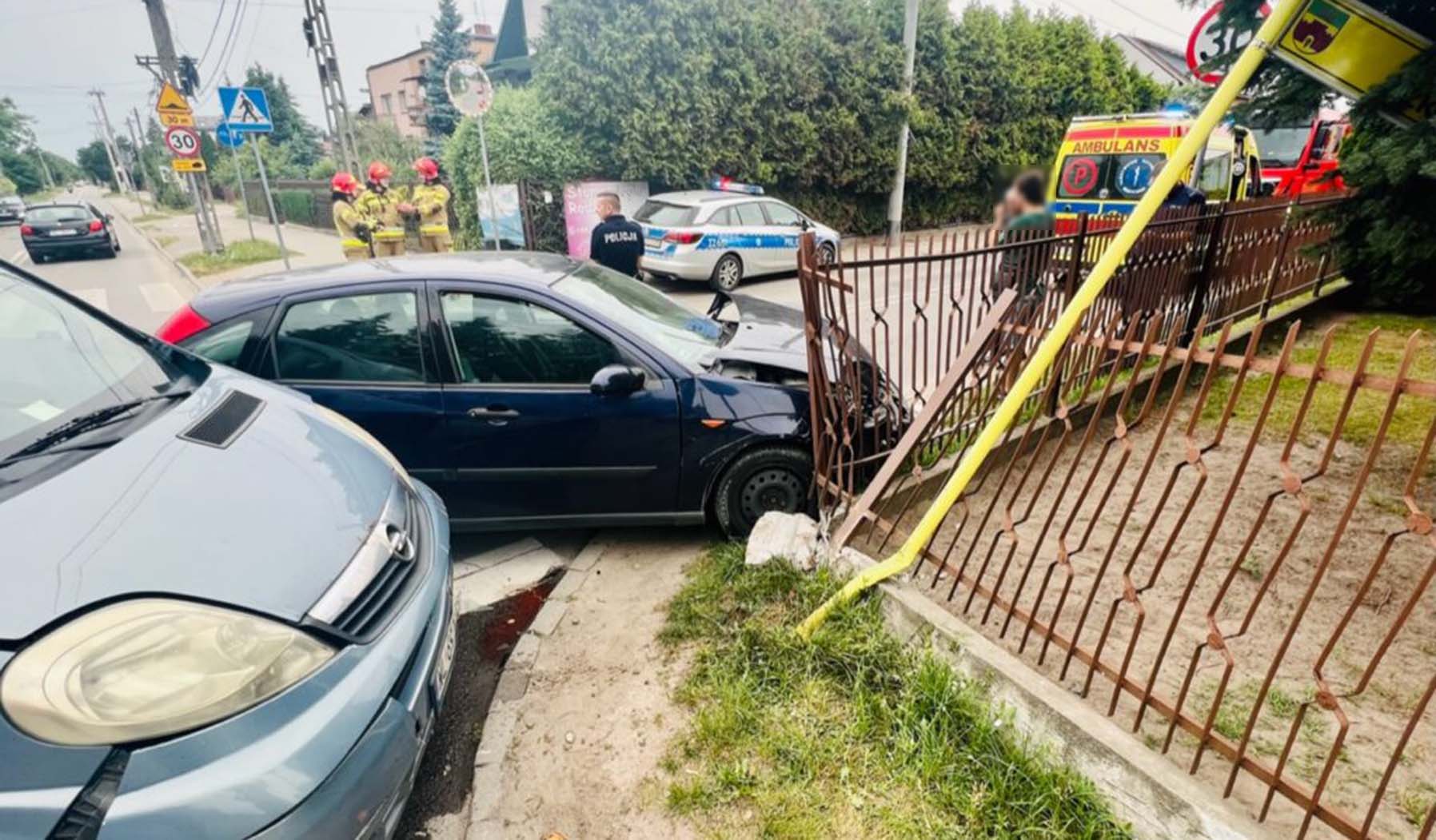 Kierowca Forda zlekceważył przepisy, spowodował wypadek i zniszczył ogrodzenie.