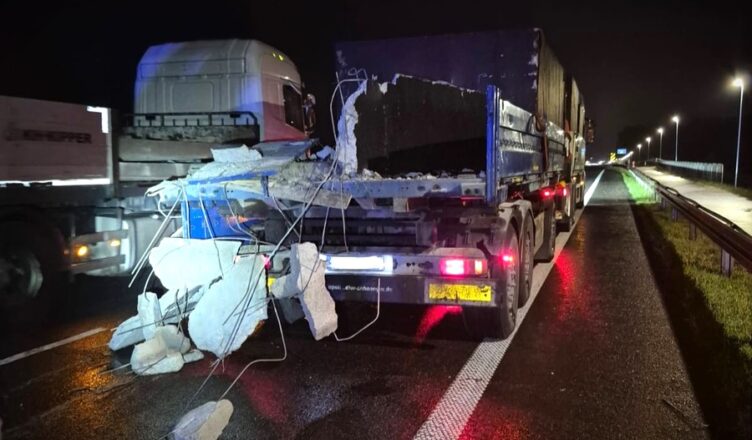 Kilkutonowy betonowy zbiornik na szambo runął z naczepy ciężarówki na jezdnię, powodując uszkodzenia drogi i barier. Nieodpowiedzialny kierowca nie tylko nieprawidłowo zabezpieczył ładunek, ale też prowadził pojazd nielegalnie, bez rejestracji czasu pracy. Tylko cudem nikomu nic się nie stało.