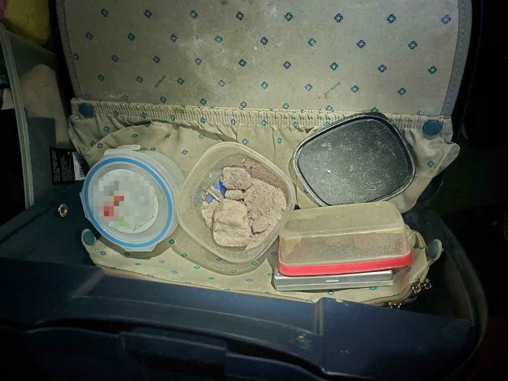 W przyczepie, w walizce funkcjonariusze odnaleźli i zabezpieczyli kilogram narkotyków, marihuanę, haszysz, kokainę, mefedron, metamfetaminę, amfetaminę, do tego wagę elektroniczną i ponad 20 tysięcy złotych.