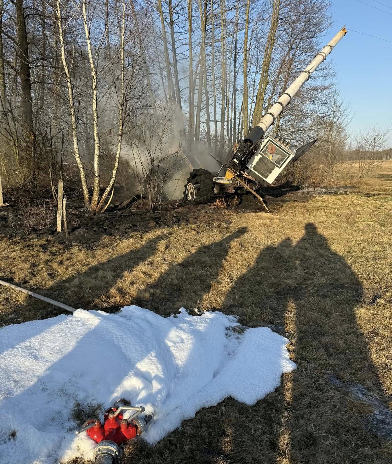 Strażacy prowadzili działania gaśnicze, zabezpieczając teren i walcząc z ogniem, który objął maszynę. Priorytetem było opanowanie pożaru oraz zapobieżenie jego rozprzestrzenieniu się na pobliski las i infrastrukturę techniczną.