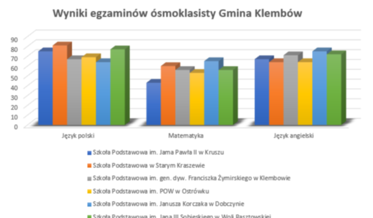 W gminie Klembów do tegorocznego egzaminu przystąpiło 80 uczniów. Poniższe informacje przedstawiają średnie wyniki z poszczególnych przedmiotów.