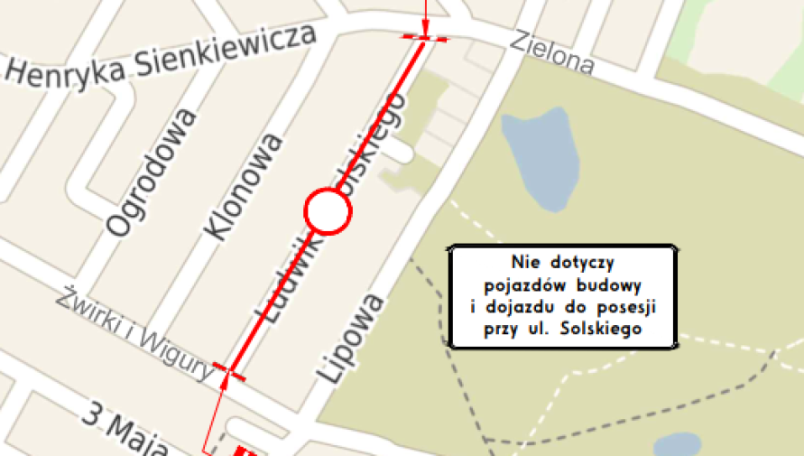 W związku z rozpoczęciem prac budowlanych związanych z budową drogi w ulicy Solskiego od dziś (28.02.2023) zostanie wprowadzona czasowa organizacja ruchu na tejże ulicy, zgodnie z załączonymi szkicami (obowiązuje zakaz wjazdu, nie dotyczy pojazdów budowy oraz dojazdu do posesji). Termin zakończenia prac to I kwartał 2024 roku.