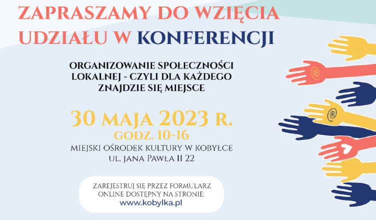 Burmistrz Miasta Kobyłka Edyta Zbieć, Ogólnopolskie Forum Organizatorów Społeczności Lokalnych na czele z Przewodniczącą Renatą Stańczyk oraz Prezes Stowarzyszenia Centrum Wspierania Aktywności Lokalnej CAL Bohdan Skrzypczak zapraszają serdecznie na Konferencję pt. „Organizowanie społeczności lokalnej – czyli dla każdego znajdzie się miejsce”, która odbędzie w dniach 29-30 maja 2023 roku w Miejskim Ośrodku Kultury w Kobyłce przy ul. Jana Pawła II 22.