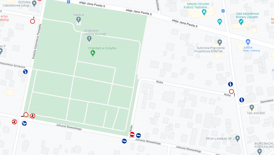 Organizacja ruchu na czas trwania święta Wszystkich Świętych w Kobyłce w dniach 29.10 – 01.11.2022 r. Drogi wokół cmentarza parafialnego (ul. Pieniążka, Niska) będą zamknięte dla ruchu na zaznaczonych odcinkach.