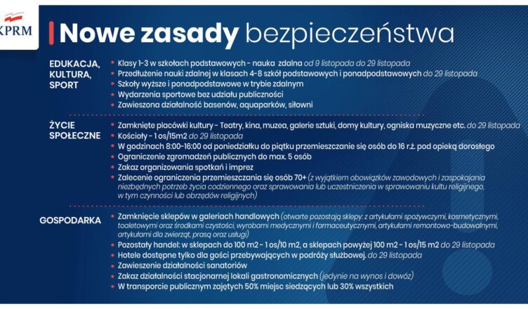 - Zamknięcie placówek kultury: teatrów, kin, muzeów, galerii sztuk, domów kultury, ognisk muzycznych ? od 7 listopada do 29 listopada;