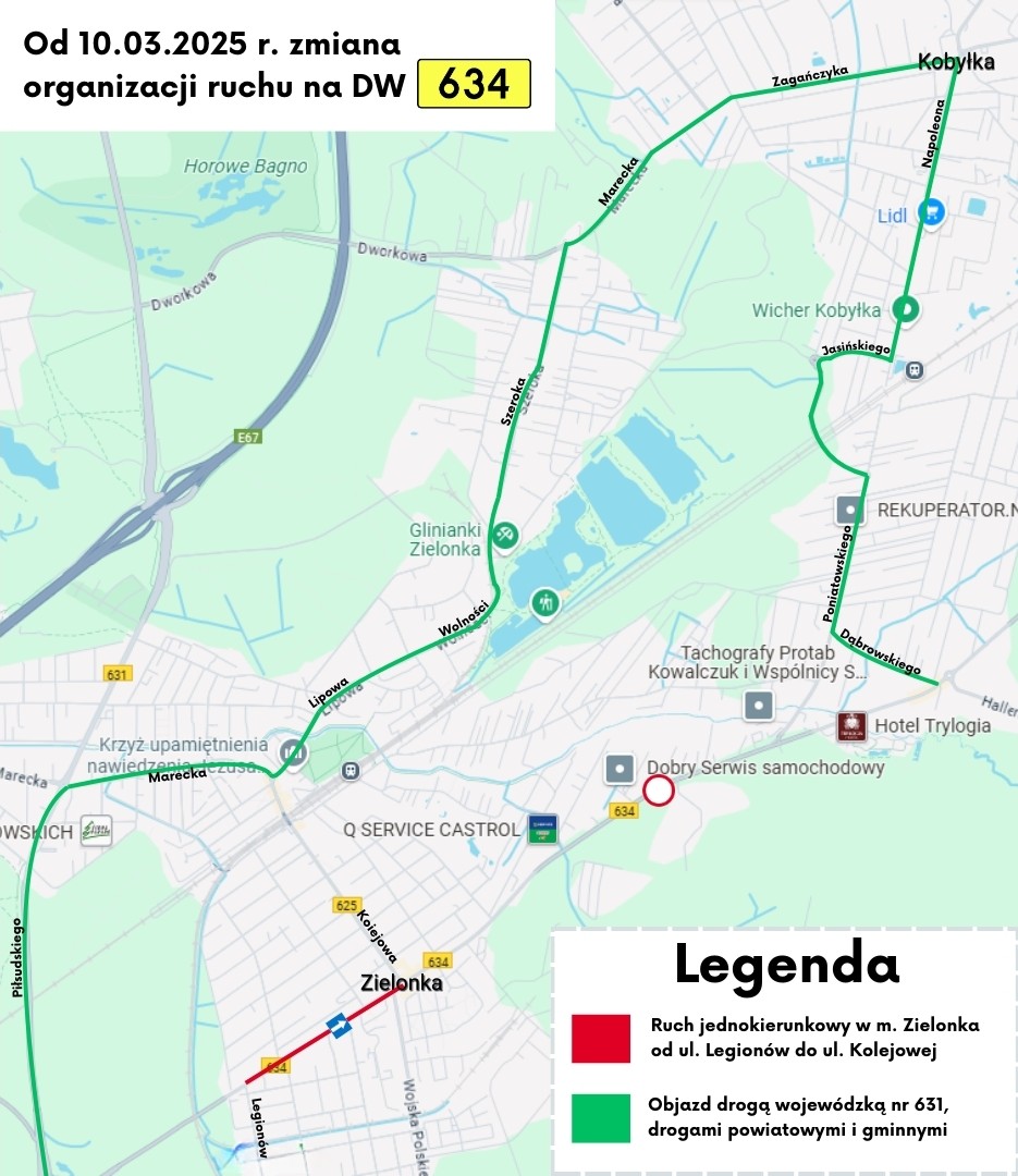 Od 10.03.2025 r. na odcinku od ul. Legionów do ul. Kolejowej w m. Zielonka zostanie wprowadzony ruch jednokierunkowy w stronę Wołomina.
