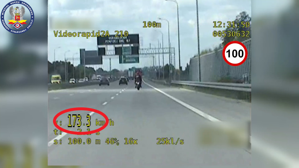 Kierujący motocyklem, który wraz z pasażerem, poruszał się Południową Obwodnicą Warszawy, przekroczył dopuszczalną prędkość aż o 73 km/h! W miejscu, gdzie obowiązuje dopuszczalna prędkość 100 km/h, jechał z prędkością 173 km/h. Podczas kontroli okazało się również, że nie posiada uprawnień do kierowania ? kontrola zakończyła się skierowaniem wniosku do sądu.