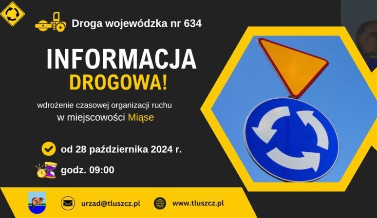 28 października o godzinie 09:00 rozpoczynają się roboty drogowe w miejscowości Miąse związane z remontem cząstkowym pierścienia ronda na drodze wojewódzkiej nr 634.