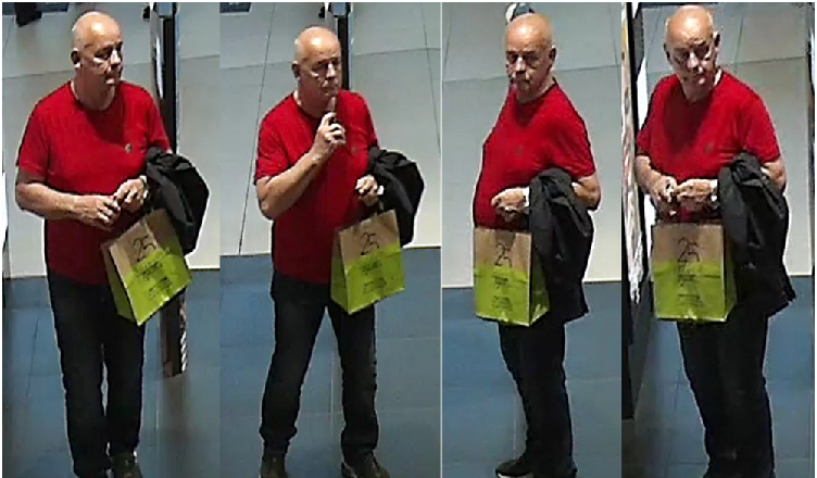 Ubrany był w koszulkę z krótkim rękawem koloru czerwonego z logiem na lewej piersi, długie czarne spodnie jeansowe, ciemne buty sportowe z białą podeszwą. Mężczyzna miał torbę papierową oraz czarną kurtkę.