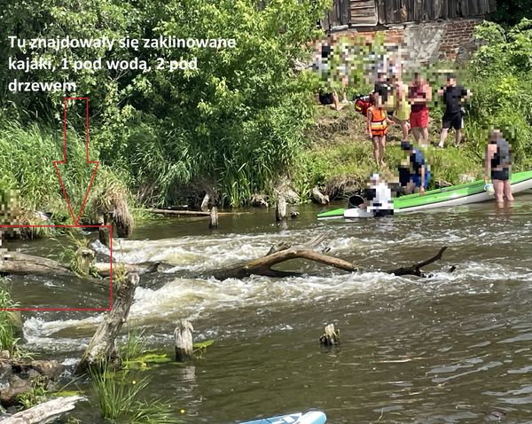 Do wypadku doszło na rzece Wkra w miejscowości Wkra..Po dojechaniu i rozpoznaniu okazało się, że dwa kajaki zaklinowały się na dużych kamieniach i drzewach. Jeden kajak znajdował się kompletnie pod wodą (użytkownicy wpadli do wody), drugi wciśnięty był pod drzewo, z którego nie mogła wydostać się kobieta.Z pomocą świadków i innych kajakarzy, udało się wydostać kobietę na brzeg rzeki, następnie wyciągnięto kajaki. Akcję ratunkową utrudniał silny nurt rzeki i kamieniste dno. Uczestników przebadano, nikomu na szczęście nic się nie stało.Akcja trwała około godzinę.