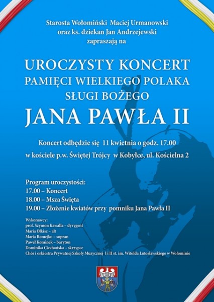 W tych godzinach Żałoby Narodowej zapraszam wszystkich mieszkańców powiatu wołomińskiego na zaplanowany wcześniej z okazji piątej rocznicy śmierci Jana Pawła II refleksyjny koncert muzyki poważnej. Odbędzie się on w kościele św. Trójcy w Kobyłce w najbliższą niedzielę 11 kwietnia o godzinie 17.00. Po koncercie zostanie odprawiona Msza święta. Spotkajmy się wspólnie w tym szczególnym dla nas czasie… – Maciej Urmanowski, Starosta Wołomiński