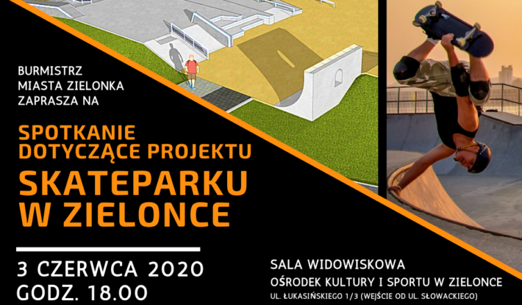 3 czerwca 2020 r. o godz. 18.00 w sali widowiskowej Ośrodka Kultury i Sportu (wejście od strony ul. Słowackiego) odbędzie się spotkanie podczas którego zostanie zaprezentowana najnowsza wersja koncepcji skateparku w Zielonce.