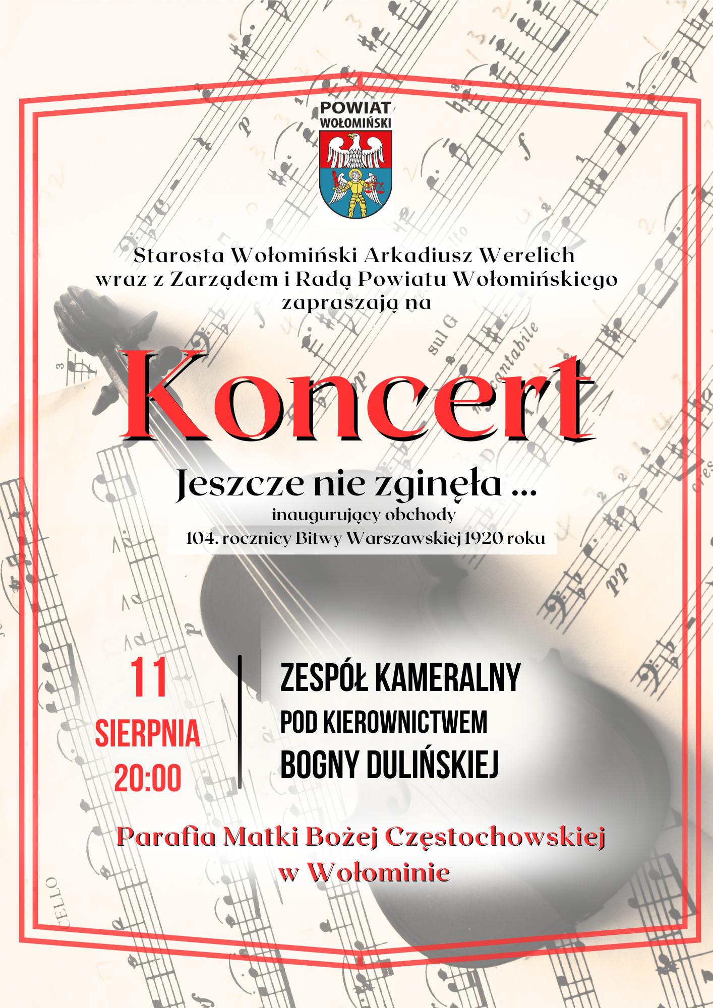 Starosta Wołomiński, Arkadiusz Werelich, serdecznie zaprasza do uczestnictwa w koncercie inaugurującym obchody 104. rocznicy Bitwy Warszawskiej 1920 roku.