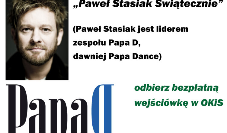 Paweł Stasiak, lider zespołu Papa D (dawniej występującego pod nazwą Papa Dance), wystąpi w niedzielę 19 grudnia o godz. 19:00. Na scenie Ośrodka Kultury i Sportu usłyszymy największe hity zespołu Papa D oraz utwory w klimacie świątecznym.