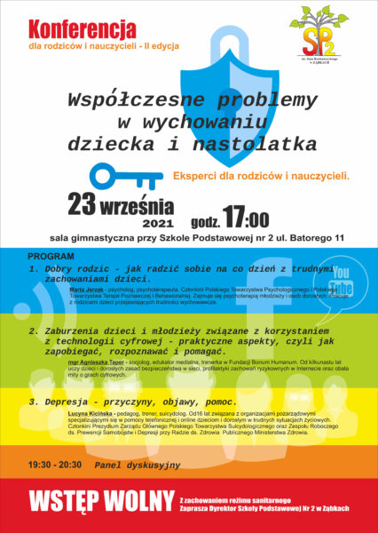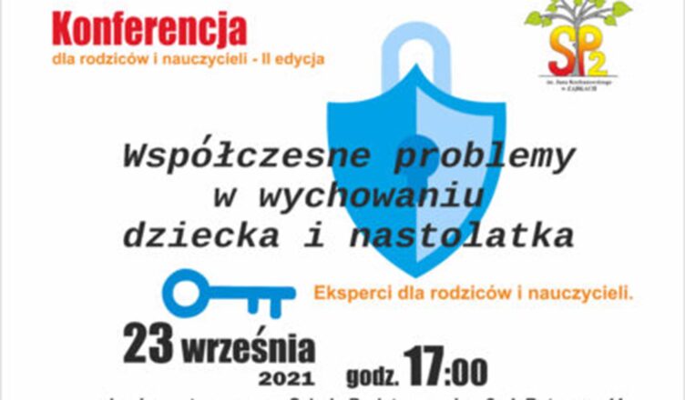 Irena Małyszczuk, dyrektor Szkoły Podstawowej nr 2 w Ząbkach, zaprasza rodziców i nauczycieli na konferencję „Współczesne problemy w wychowaniu dziecka i nastolatka”. która odbędzie się w dniu 23 września 2021 r. o godzinie 17:00 w sali gimnastycznej Szkoły Podstawowej nr 2, przy ulicy Batorego 11.