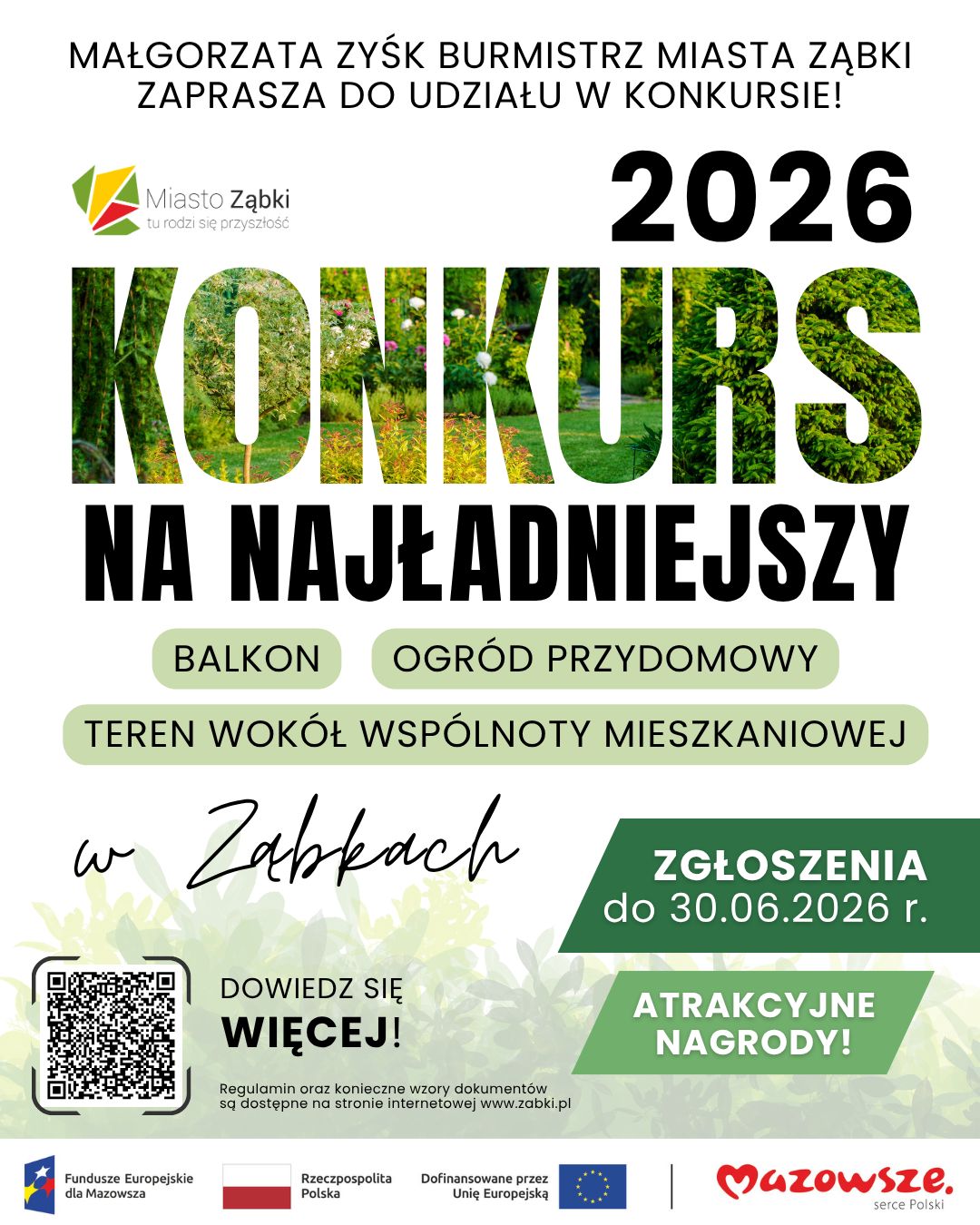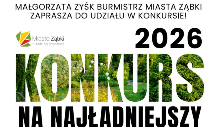 ub zdjęcia dokumentów) przesłać na adres e-mail: konkurs@zabki.pl z dopiskiem „ NAJŁADNIEJSZY BALKON, PRZYDOMOWY OGRÓD KWIATOWY I TEREN WOKÓŁ WSPÓLNOTY MIESZKANIOWEJ 2026 ” lub dostarczyć wraz z podpisanymi ww. dokumentami do Biura Obsługi Mieszkańców Urzędu Miasta Ząbki (wejście A) do godz. 16:00