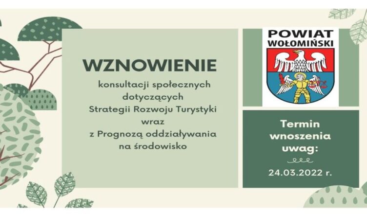 Zarząd Powiatu Wołomińskiego zaprasza mieszkańców powiatu wołomińskiego przedstawicieli samorządów, podmioty gospodarcze oraz organizacje pozarządowe działające na terenie powiatu do ponownego wzięcia udziału w konsultacjach społecznych w sprawie projektu Strategii Rozwoju Turystyki Powiatu Wołomińskiego na lata 2021-2030 wraz z Prognozą oddziaływania na środowisko.