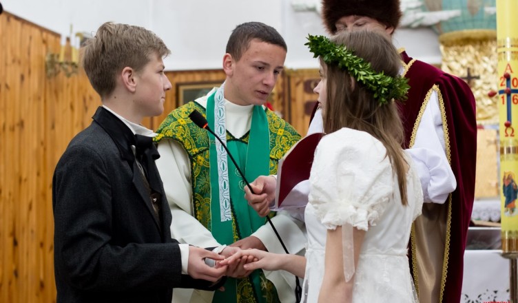 Tu w progach kościoła powitał ich proboszcz ks. Józef Rutkowski. Młodzież odtworzyła uroczystość zaślubin. Rozbrzmiała muzyka F. Chopina w wykonaniu Barbary Żarnowieckiej, Wiktora Brzuchacza i Łukasza Wrońskiego. Korowód zatrzymał się przy miejscowym cmentarzu, gdzie para młoda złożyła kwiaty na grobie księdza Jakuba Dosta, który w latach 1790 ? 1840 był proboszczem w Sulejowie. Ciąg dalszy zaślubin odbył się w Strachówce. Było przywitanie nowożeńców chlebem i solą przez dziadka Józefa Sobieskiego, miecznika liwskiego i babcię Hilarię. Następnie obrzęd oczepin panny młodej, czyli zdjęcie wianka i założenie czepka, który nosiły mężatki. Nie zabrakło na niej również ostatniego elementu, weselnego korowaja, który dzisiaj zastąpiony został tortem.