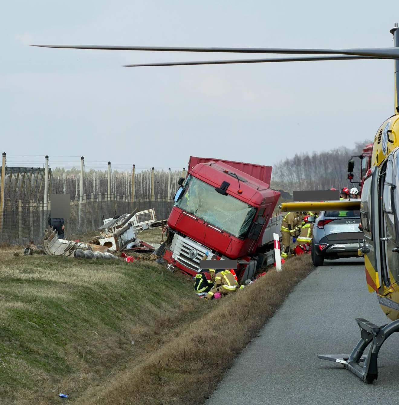 Do zdarzenia doszło w czwartek, 19 marca 2026 roku, około godziny 14:30. Ze wstępnych ustaleń wynika, że kierujący ciężarówką marki Renault z nieustalonych przyczyn zjechał z drogi. W wyniku gwałtownego manewru zarówno kierowca, jak i pasażer zostali wyrzuceni z pojazdu przez przednią szybę.