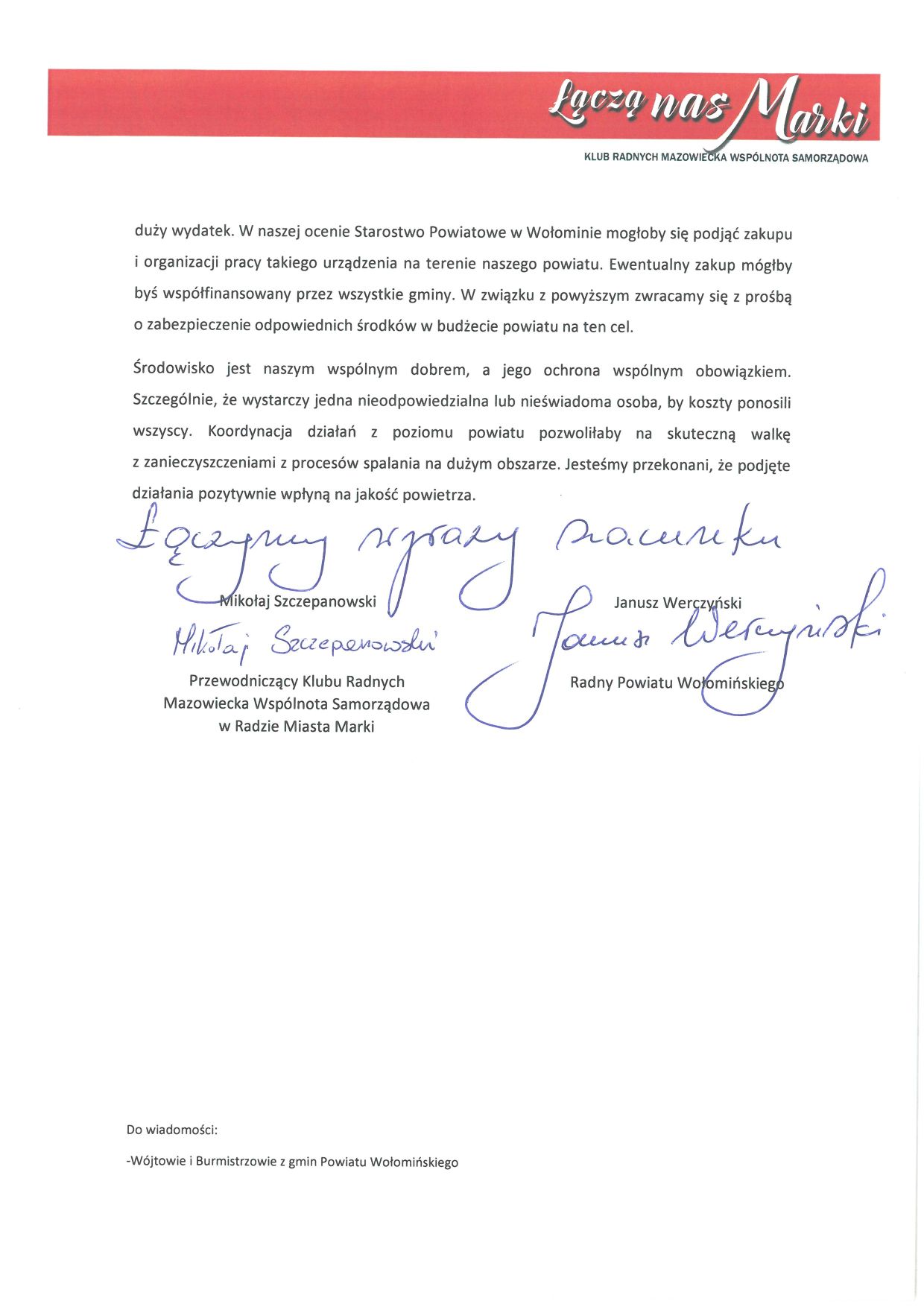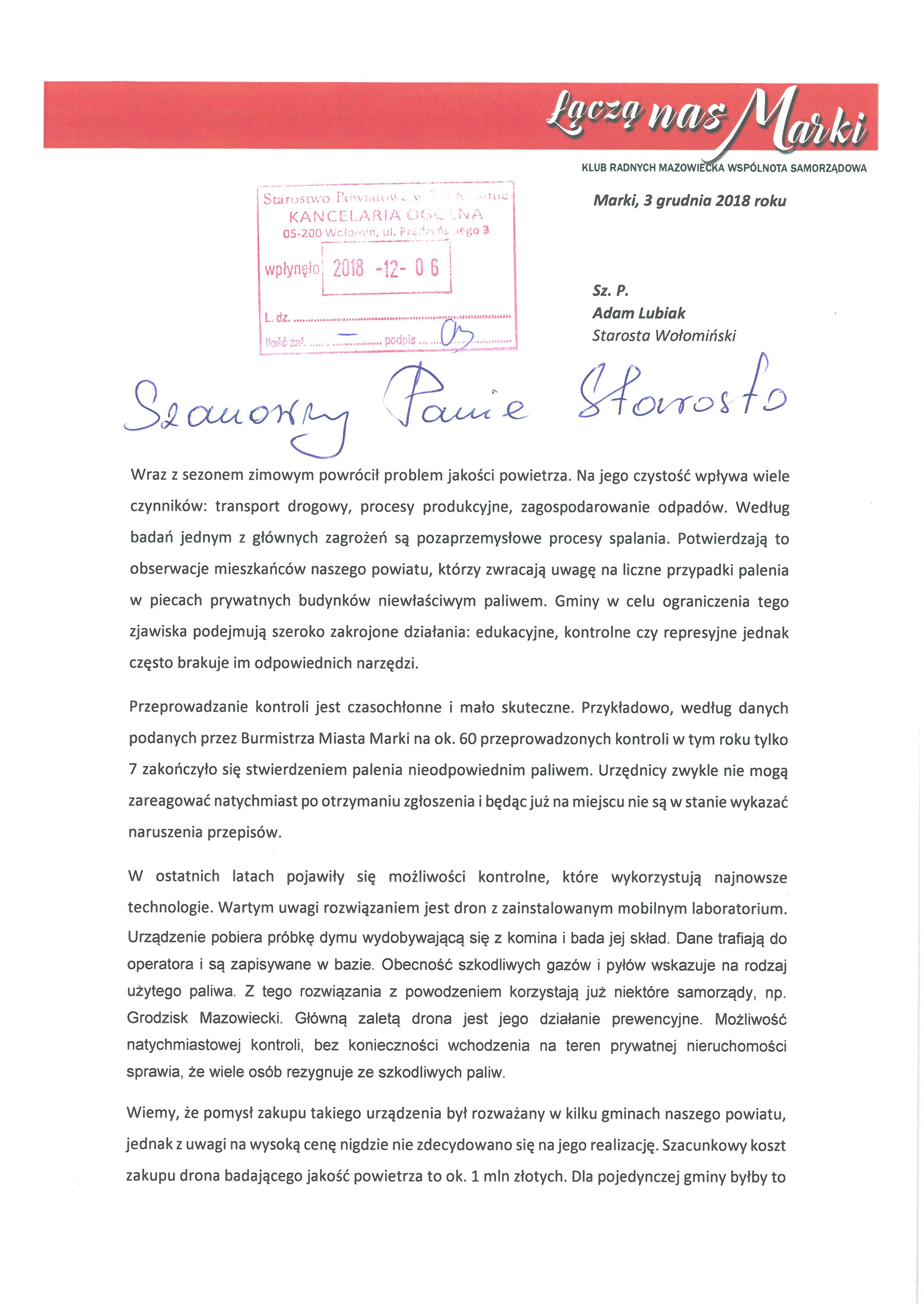 Problemem jest za to cena urządzenia. Szacunkowo koszt zakupu odpowiedniego drona to milion złotych. Za dużo dla pojedynczej gminy. Jedno miasto to często też za mały obszar, by w pełni wykorzystać możliwości urządzenia. Dlatego razem z radnym powiatowym Januszem Werczyńskim wystąpiliśmy do Adama Lubiaka, Starosty Wołomińskiego z pomysłem zakupu drona przez Starostwo Powiatowe. Organizacja jego pracy na terenie całego powiatu, pozwoliłaby skutecznie dbać o jakość powietrza na dużym obszarze.