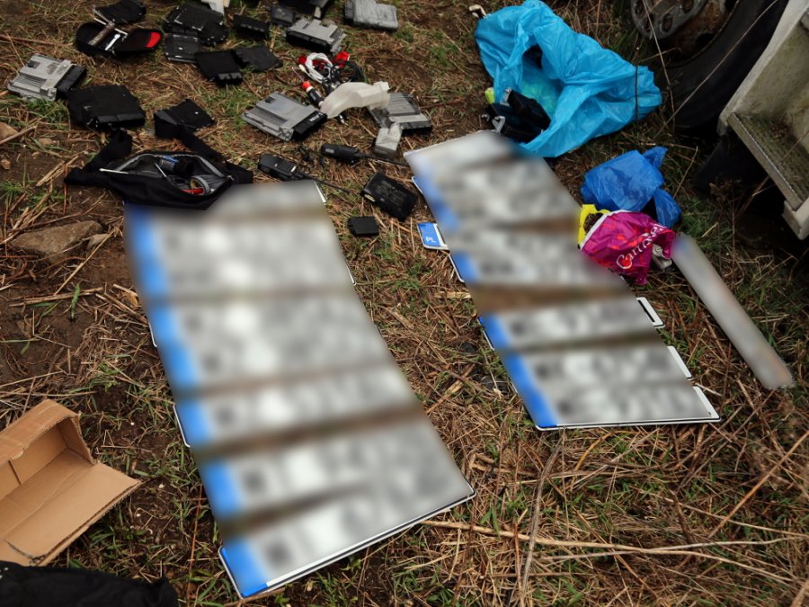 Z uwagi na fakt, że 36-latek wsiadał do samochodów mieszczących się na sąsiedniej posesji, policjanci przeszukali również te pojazdy. W kabinie ciągnika siodłowego zabezpieczyli 13 kompletów tablic rejestracyjnych, jak się okazało po sprawdzeniu w systemach informatycznych, podrobionych i nie przypisanych do istniejących pojazdów zarejestrowanych w Polsce, 28 sterowników rożnych marek pojazdów, 2 zagłuszarki GPS i GSM, 2 radiostacje, a także inne części i podzespoły samochodowe.