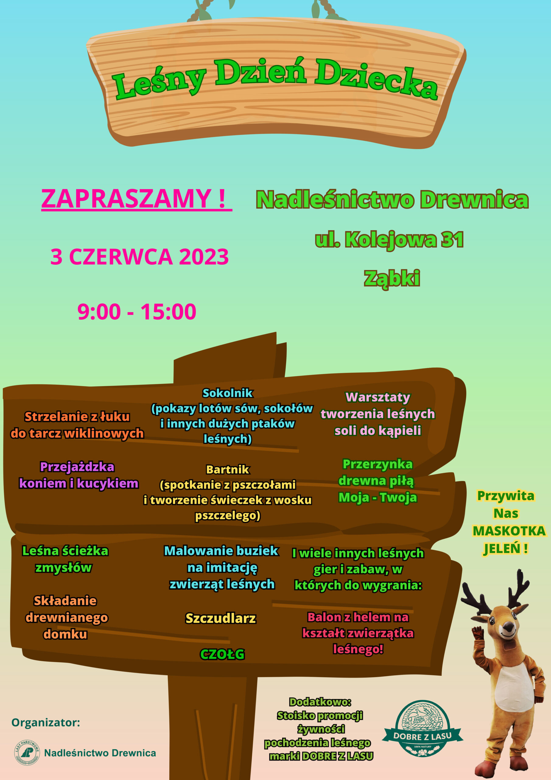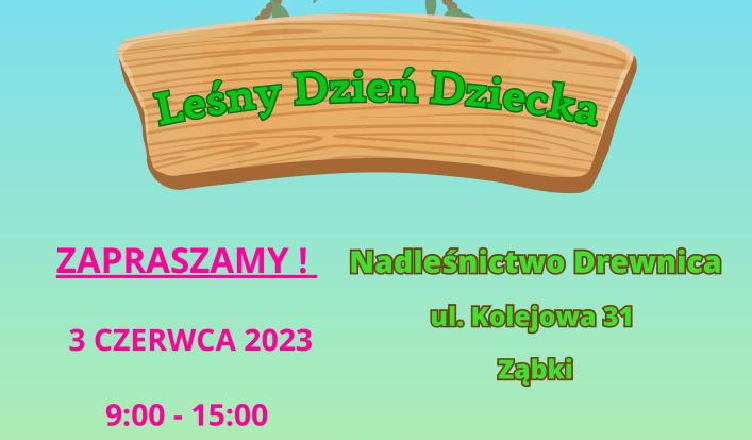 Nadleśnictwo Drewnica w dniu 3 czerwca 2023 r. (sobota) zaprasza na Leśny Dzień Dziecka. Festyn odbędzie się na terenie siedziby Nadleśnictwa Drewnica.