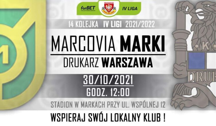 W najbliższą sobotę, 30 października, pierwszy zespół Marcovii zmierzy się w Markach z Drukarzem Warszawa. Spotkanie rozegrane zostanie w ramach 14 kolejki forBet IV ligi. Pierwszy gwizdek sędziego zabrzmi o godz. 12:00.