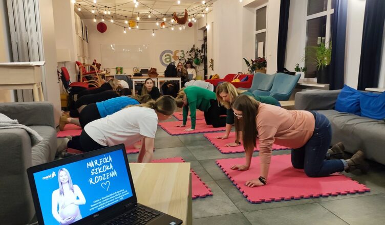 Warsztaty z fizjoterapeutką to wykład i ćwiczenia przygotowujące ciało mamy do porodu i połogu, a także wypracowanie właściwych fizjologicznie pozycji podczas karmienia i spania maluszków.