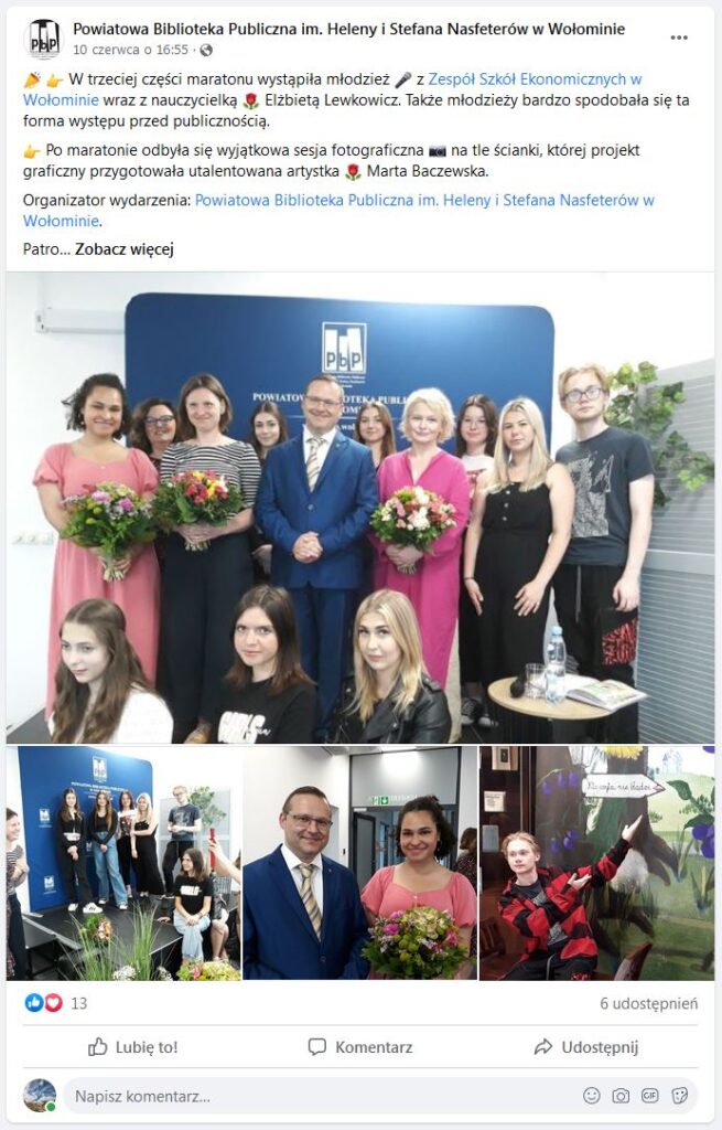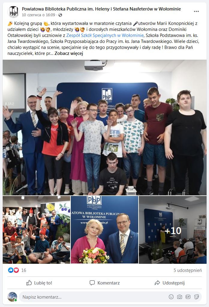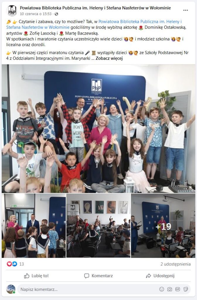 8 czerwca w Powiatowej Bibliotece Publicznej im. Heleny i Stefana Nasfeterów w Wołominie z okazji Dni z Marią Konopnicką, dzieci ze Szkoły Podstawowej z Zespołu Szkół Nr 4 im. Marynarki Wojennej RP w Wołominie spotkały się z aktorką Dominiką Ostałowską i plastyczką Zosią Lasocką w ramach projektu „Maria Konopnicka. Poetka dzieci”.