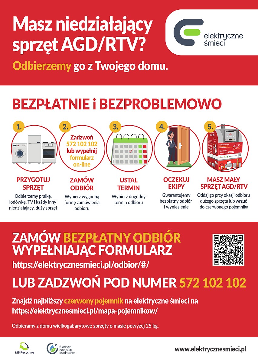 Jeśli masz w domu duży, zużyty sprzęt RTV lub AGD może być on odebrany bezpłatnie. Od kilku lat Urząd Miasta Marki współpracuje ze spółką MB Recycling, która m.in. zajmuje się odbiorem elektroodpadów z czerwonych pojemników ustawionych w Markach. Spółka prowadzi również bezpłatne odbiory bezpośrednio z domów – zaznacza Sebastian Waśkiewicz z Wydziału Ochrony Środowiska.