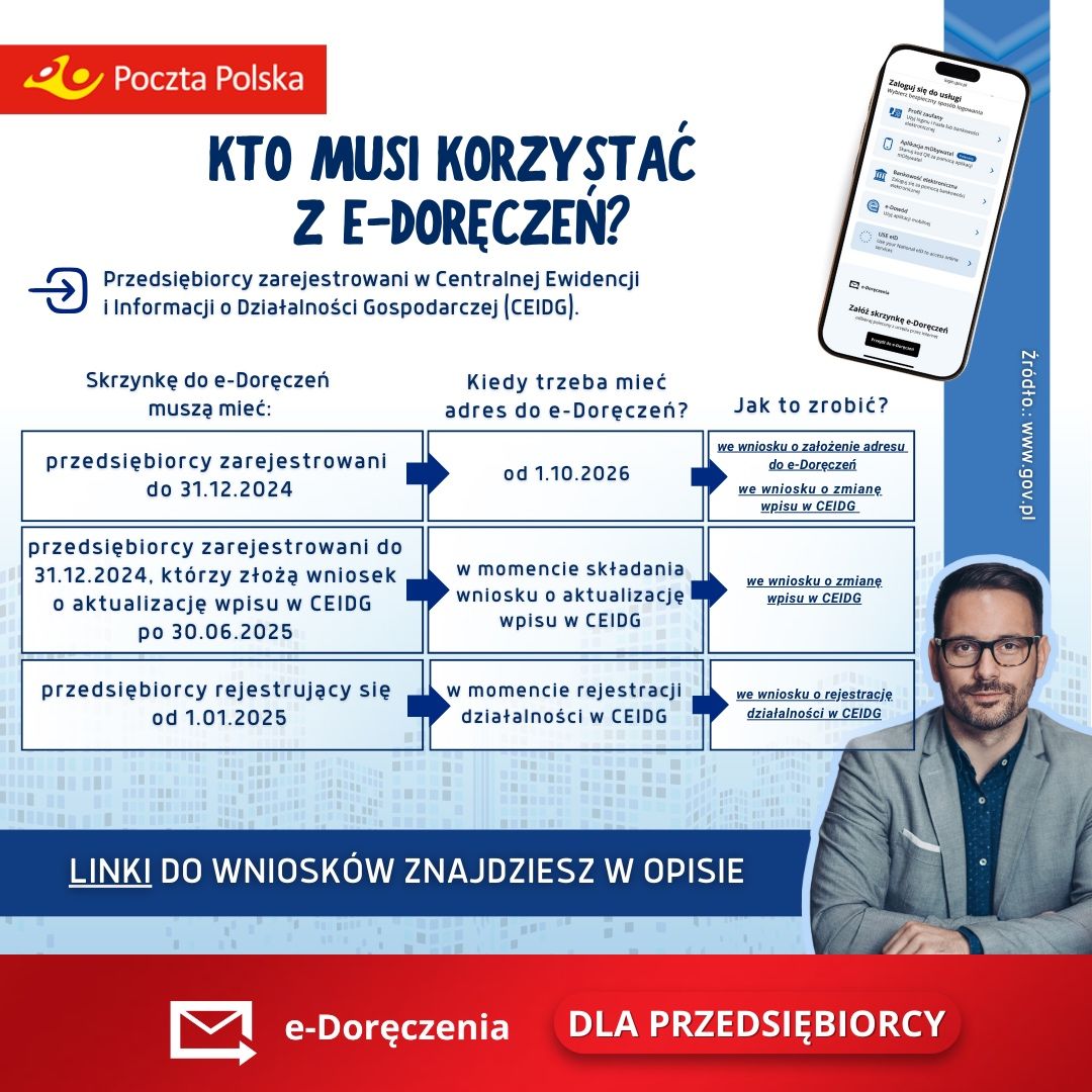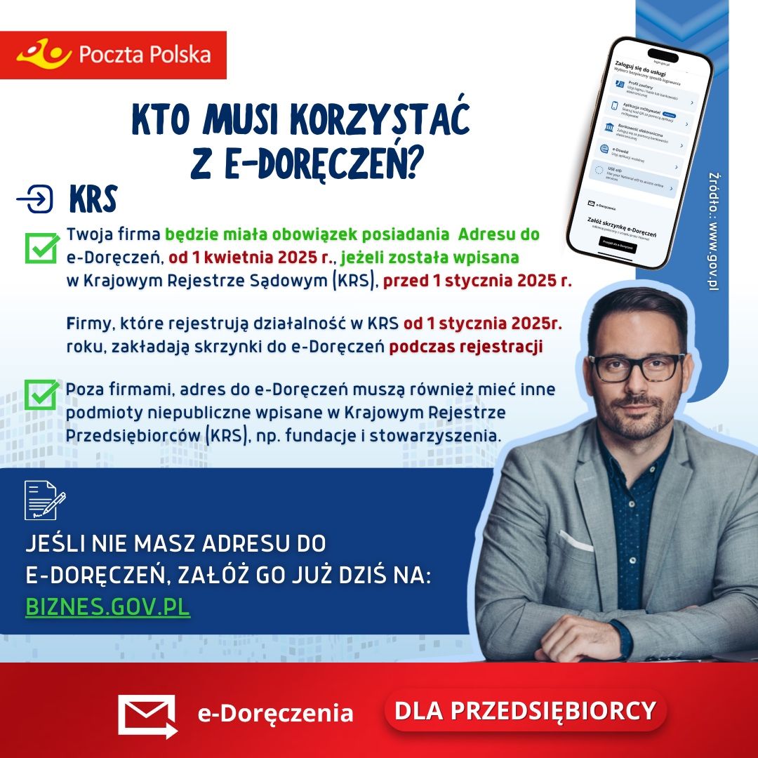 Twoja firma będzie miała obowiązek korzystania z e-Doręczeń, jeżeli jest zarejestrowana w Centralnej Ewidencji i Informacji Działalności Gospodarczej (CEiDG) lub Krajowym Rejestrze Sądowym (KRS). Adres do e-Doręczeń będą musiały mieć też inne podmioty niepubliczne wpisane do rejestru przedsiębiorców KRS, na przykład fundacje i stowarzyszenia. Terminy i dodatkowe informacje znajdziesz na Biznes.gov.pl.