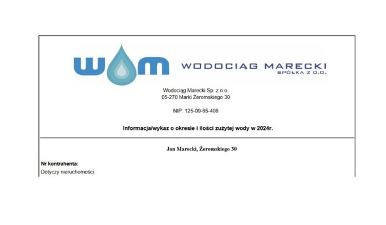 - w grudniu do papierowych faktur dołączaliśmy oddzielną „Informację/wykaz o okresie i ilości zużytej wody w 2024 r”. Informowaliśmy o tym Państwa w listopadzie ubiegłego roku.