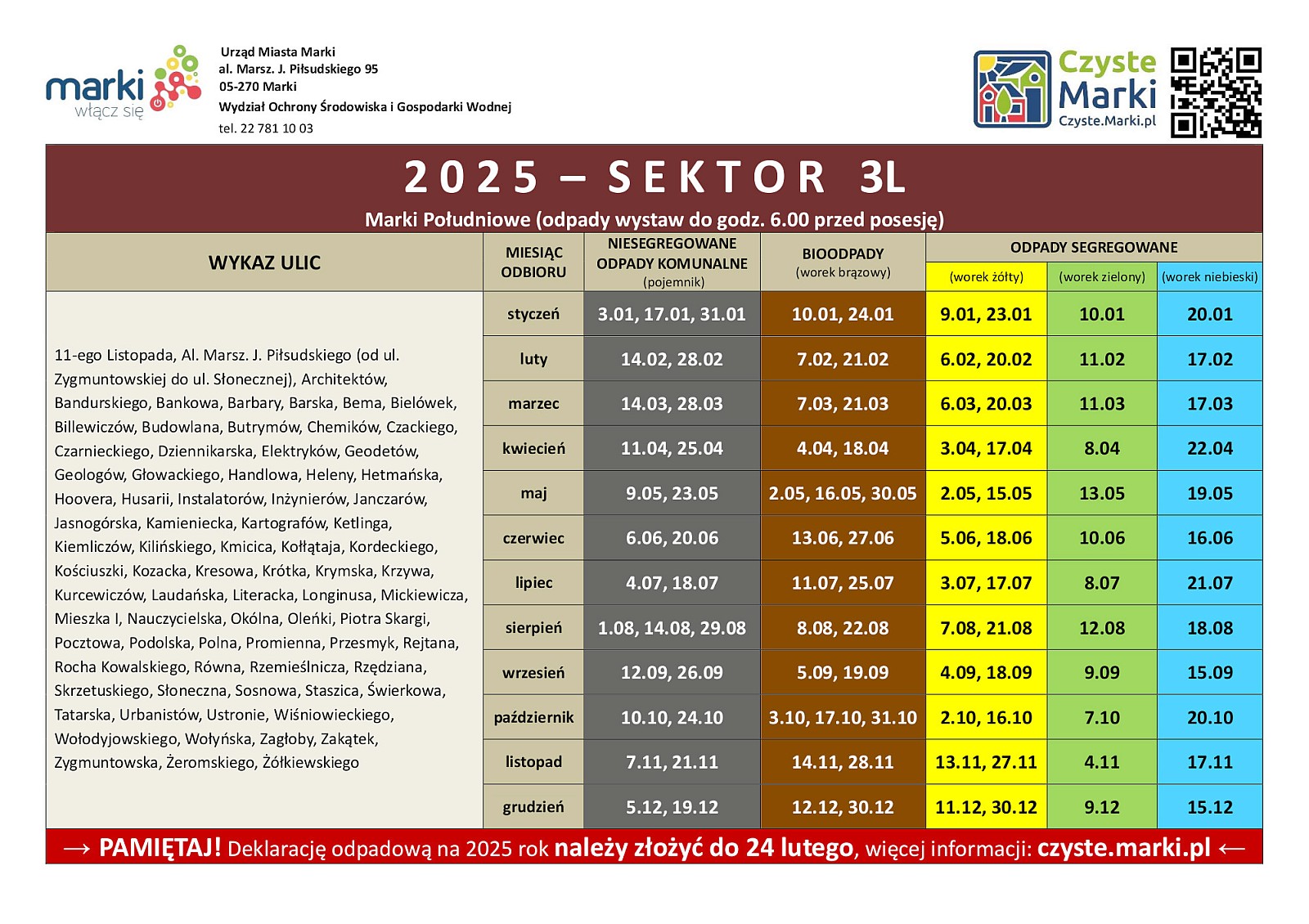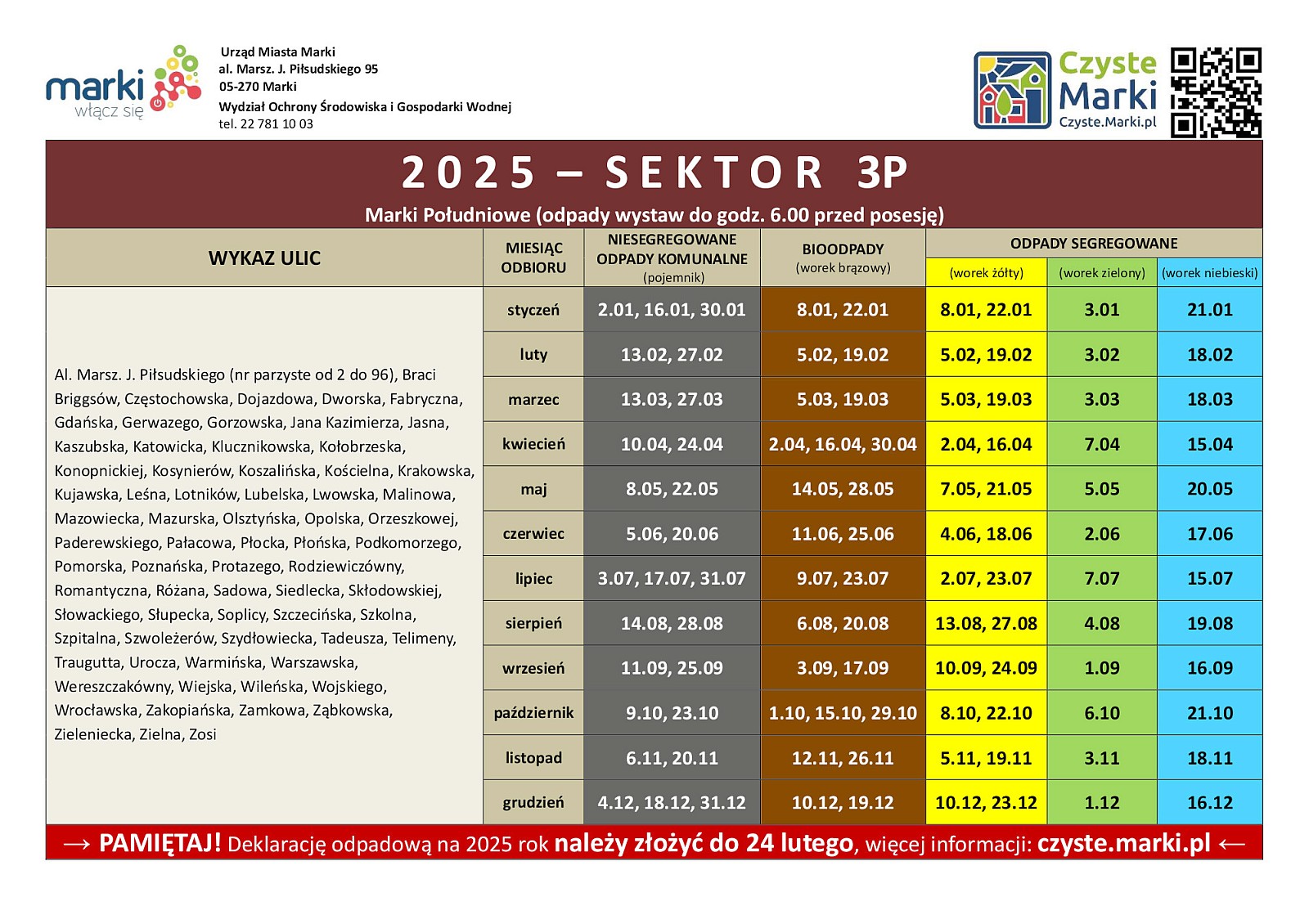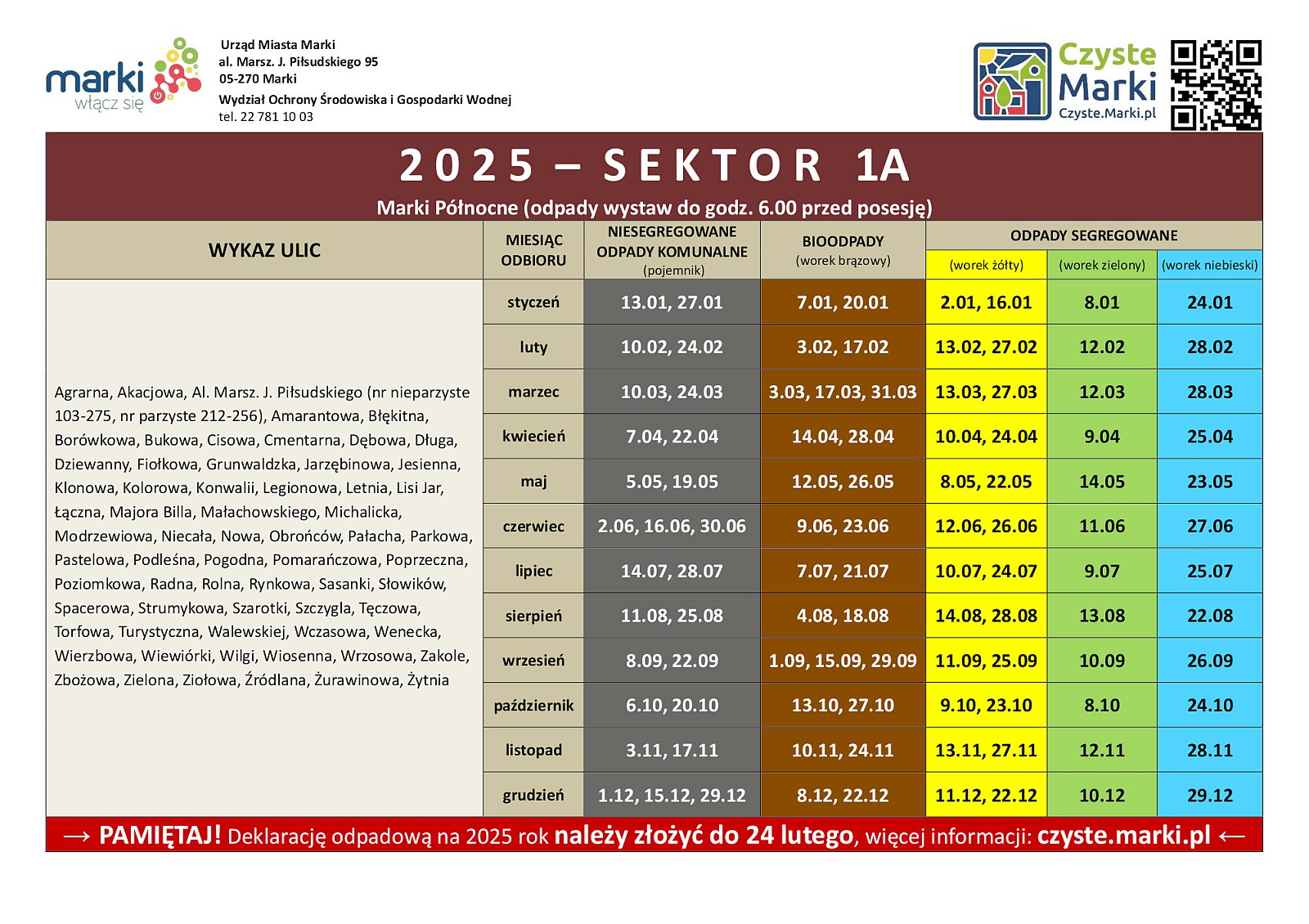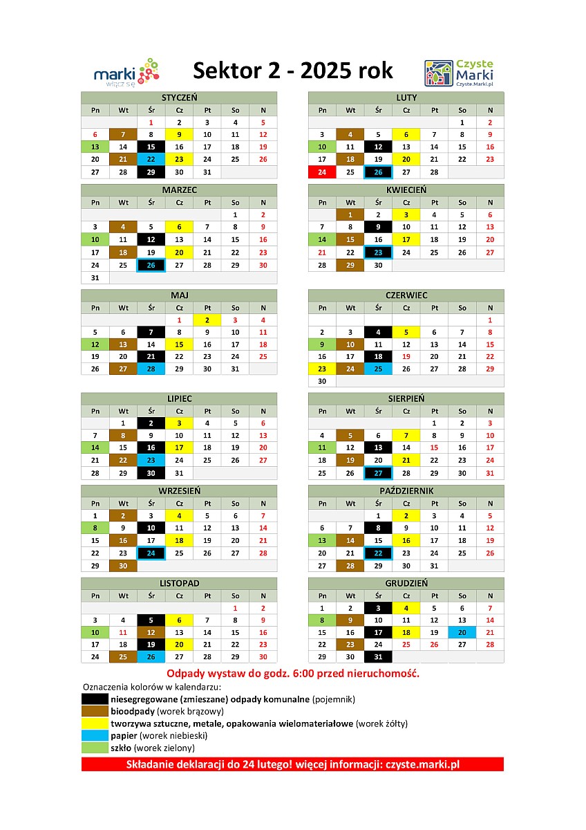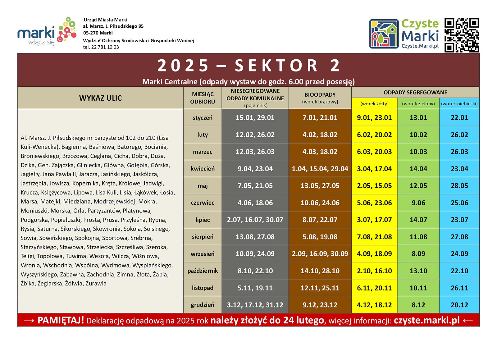 Przedstawiamy harmonogram odbioru odpadów w zabudowie jednorodzinnej w 2025 roku. Wzorem poprzedniego roku, marecki ratusz przygotował harmonogramy dla każdego sektora (podsektora) w formie kalendarza, który zdecydowanie ułatwia wystawianie odpadów w określonych terminach. Zachęcamy do zapoznania się z nowymi terminami.