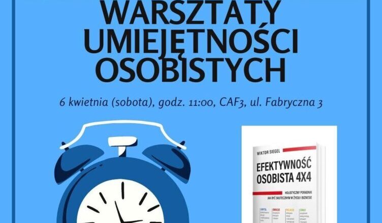 Jeżeli w każdym, kolejnym roku rośnie ilość spraw, które masz do załatwienia i masz coraz mniej czasu na ich realizację, a jednocześnie masz nadal poczucie marnowania czasu oraz braku równowagi między sprawami zawodowymi i prywatnymi, to zapraszamy Cię na spotkanie z autorem książki „Efektywność Osobista 4×4” Panem Wiktorem Siegel mieszkańcem naszego miasta. – zachęca organizator warsztatów