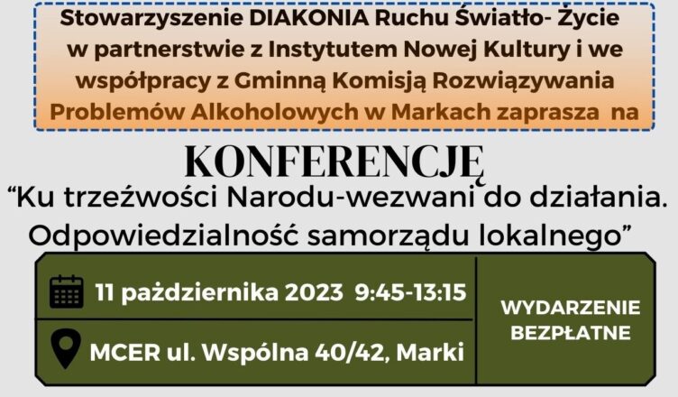1 października odbędzie się bezpłatna konferencja dotycząca problemu choroby alkoholowej w społeczności lokalnej Konferencja „Ku trzeźwości Narodu – wezwani do działania.Odpowiedzialność samorządu lokalnego” odbędzie się w Mareckim Centrum Edukacyjno – Rekreacyjnym.