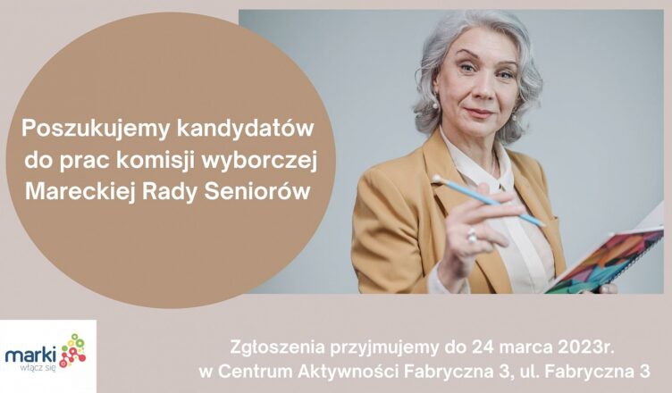 Zgodnie z ogłoszeniem Burmistrza z 20 marca 2023 roku poszukujemy kandydata na przedstawiciela Seniorów do Komisji Wyborczej do przeprowadzenia wyborów do Mareckiej Rady Seniorów – informuje UM Marki