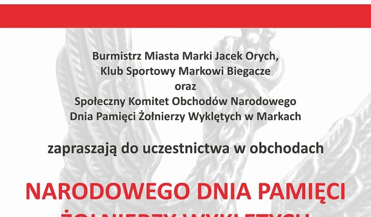 Burmistrz Miasta Marki Jacek Orych, Klub Sportowy Markowi Biegacze oraz Społeczny Komitet Obchodów Narodowego Dnia Pamięci Żołnierzy Wyklętych zapraszają do uczestnictwa w corocznych obchodach Narodowego Dnia Pamięci Żołnierzy Wyklętych.