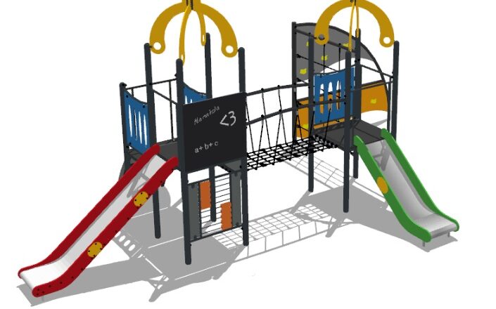 W pierwszym etapie robót zdejmujemy starą nawierzchnię asfaltową, potem przygotujemy trawiastą i zamontujemy zabawki. Wśród nich będą: zestaw z wieżą, zjeżdżalnią i pomostem linowym (na ilustracji), dwie huśtawki (wagowa i wahadłowa) oraz dwa bujaki – informuje Paweł Pniewski, zastępca burmistrza Marek.