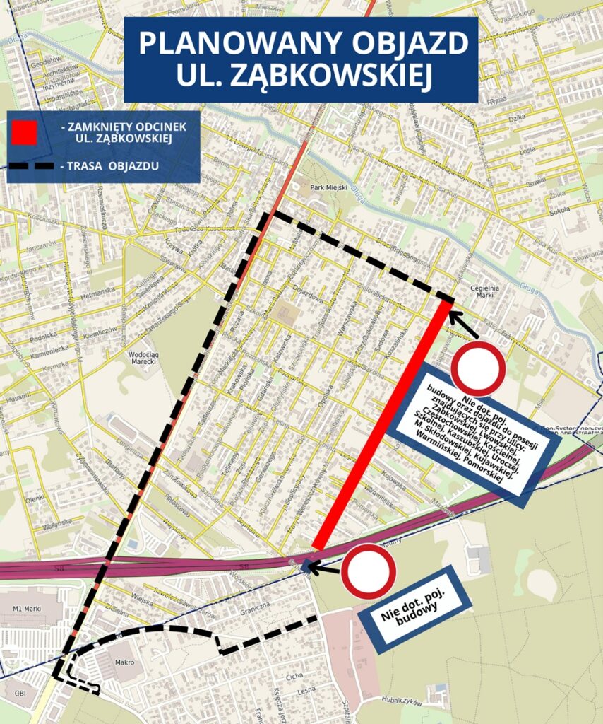 Wykonawca wytyczył objazdy, które prowadzą ulicami Ząbek, Aleją Piłsudskiego i Fabryczną.