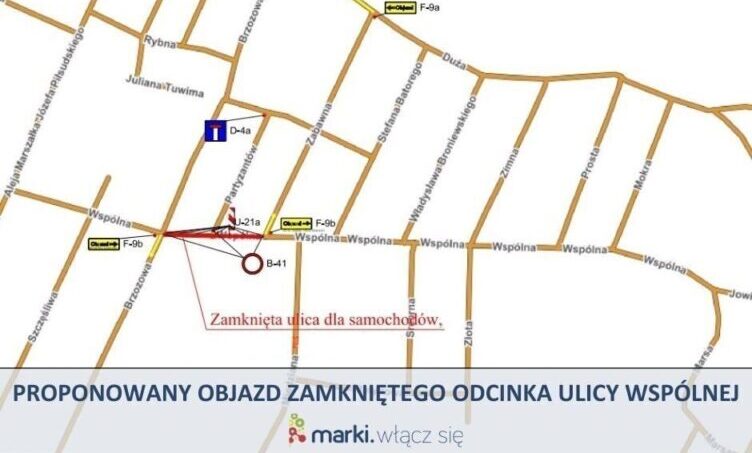 Przepraszamy za tymczasowe utrudnienia w ruchu kołowym. Objazd dla pojazdów będzie prowadzić ulicami: Brzozową, Stawową, Saturna, Marsa, Jowisza (lub odwrotnie). Alternatywnie można też skorzystać z ulic: Dużej i Zabawnej (lub odwrotnie).Wyjazd z ulicy Partyzantów będzie prowadzić ulicą Stefana Starzyńskiego. Z ulicy Zabawnej będzie można skręcić w lewo w ul. Wspólną oraz wjechać na teren Marcovii.