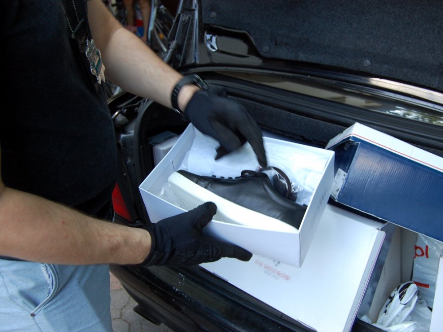 Okazało się, że 63-letni Marek F. w bagażniku samochodu przewoził pudełka z butami opatrzone zastrzeżonymi znakami towarowymi znanych światowych marek. Mężczyzna nie potrafił wytłumaczyć, skąd pochodzi obuwie i dokąd z nim jedzie. Policjanci podjęli decyzję o powrocie na posesję. Tam dokładnie przeszukali samochód, w którym znaleźli 21 pudełek z obuwiem.