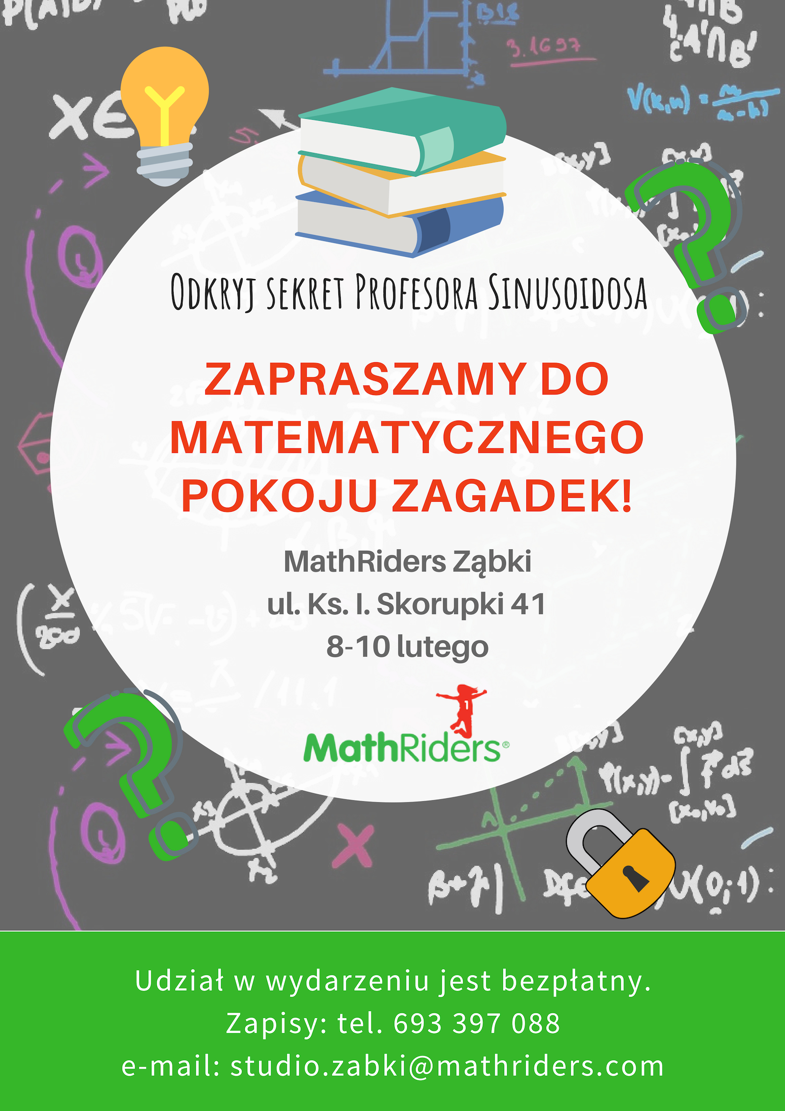W dniach 8-10 lutego 2019 r., w Studiu Nauczania MathRiders Ząbki odbędzie się niecodzienne wydarzenie dla dzieci. Specjalny matematyczny pokój zagadek kryje w sobie różnorodne łamigłówki, szyfry i kody, których rozwiązanie krok po kroku, doprowadzi uczestników do odkrycia tajemnicy Profesora Sinusoidosa. Udział w wydarzeniu jest bezpłatny.