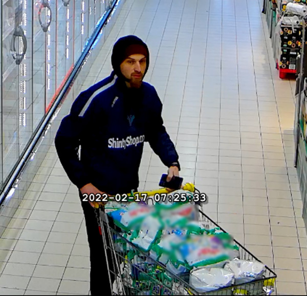 Mężczyzna, który dokonał kradzieży: wiek około 35 lat, około 180 cm wzrostu, szczupłej budowy ciała, ubrany w ciemną bluzę z kapturem z angielskim białym napisem ?shintyshop.com?, ciemnoczerwoną czapkę, czarne spodnie i czarne buty, posiadał zarost na twarzy.
