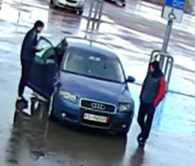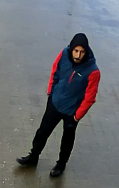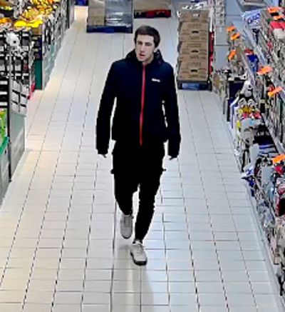 Trzeci mężczyzna, który był kierowcą i otworzył drzwi automatyczne sklepu, aby sprawca kradzieży mógł opuścić obiekt: wiek około 30-35 lat, około 180 cm wzrostu, ciemna kurtka z czerwonymi rękawami, czarny kaptur na głowie, ciemne spodnie, czarne buty, zarost na twarzy.