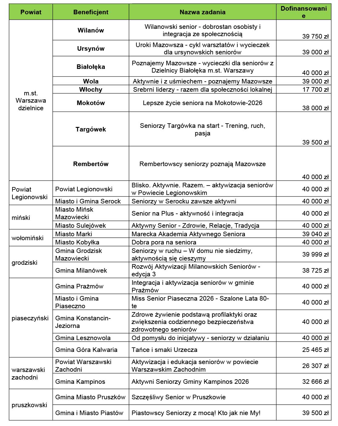 O dofinansowanie mogły ubiegać się powiaty, gminy, miasta na prawach powiatu oraz dzielnice Warszawy, przy których została powołana i funkcjonuje rada seniorów. Maksymalna kwota wsparcia to 40 tys. zł.