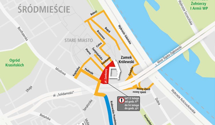 Od środy, 13 lutego, od godz. 6.00 do czwartku, 14 lutego, do godz. 6.00 zamknięty dla ruchu samochodów oraz pieszych będzie pl. Zamkowy (wraz z tzw. Dziedzińcem Trójkątnym i placem przed kościołem św. Anny).