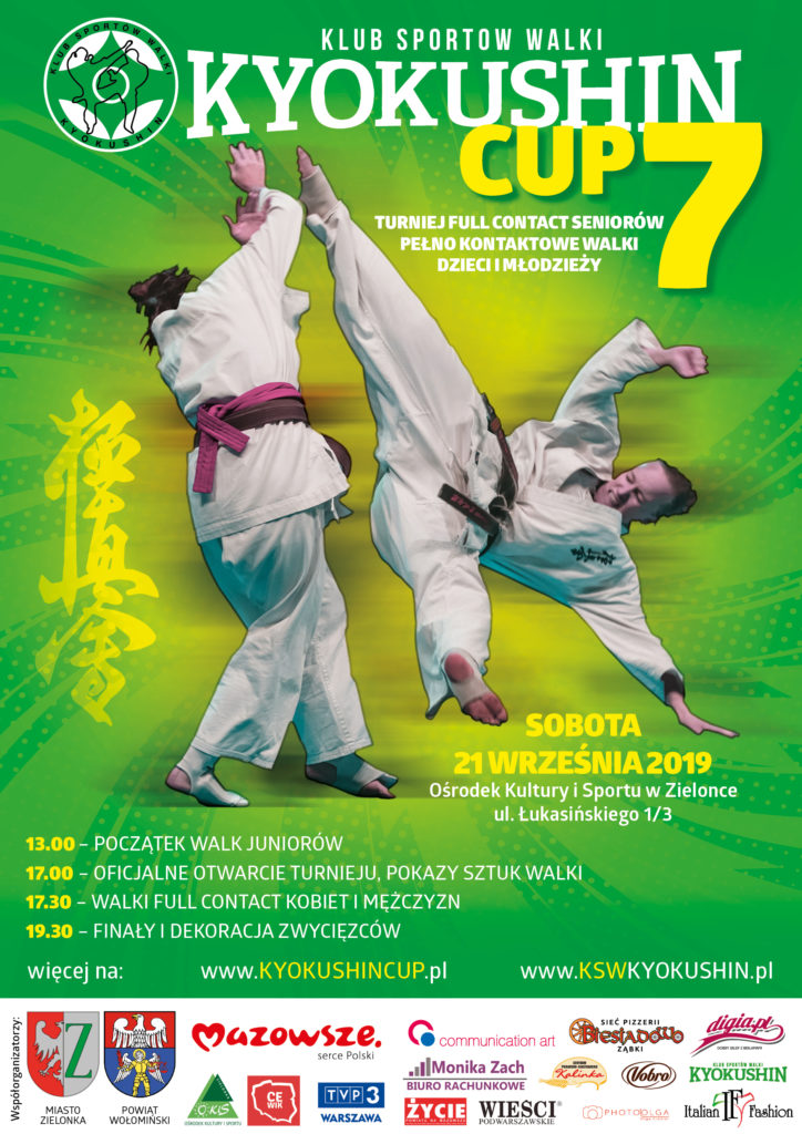 Turniej odbędzie się w sobotę 21 września w hali sportowej Ośrodka Kultury i Sportu w Zielonce, przy ul. Łukasińskiego 1/3. Patronat honorowy nad KYOKUSHIN CUP 7 objęli: Marszałek Województwa Mazowieckiego, Starosta Powiatu Wołomińskiego oraz Burmistrz Miasta Zielonka.