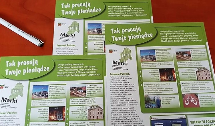Na odwrocie decyzji podatkowej znajduje się odpowiedź na pytanie, jak pracują pieniądze Markowian. W przyjaznej formie przedstawiono inwestycje realizowane w 2018 r. jak i te, które rozpoczną się w tym roku. UM Marki zachęca też do tego, żeby w rocznym zeznaniu podatkowym PIT wskazać Marki jako miejsce zamieszkania. To bardzo ważne. Wówczas część pieniędzy, które i tak płacą mieszkańcy, trafi do mareckiego samorządu. To znakomicie ułatwi realizowanie kolejnych inwestycji. UM Marki zaprosza do skorzystania z nowego portalu obsługi interesanta marki.eboi.pl. To nowe informatyczne rozwiązanie, które pomoże załatwiać sprawy z urzędem na drodze elektronicznej.
