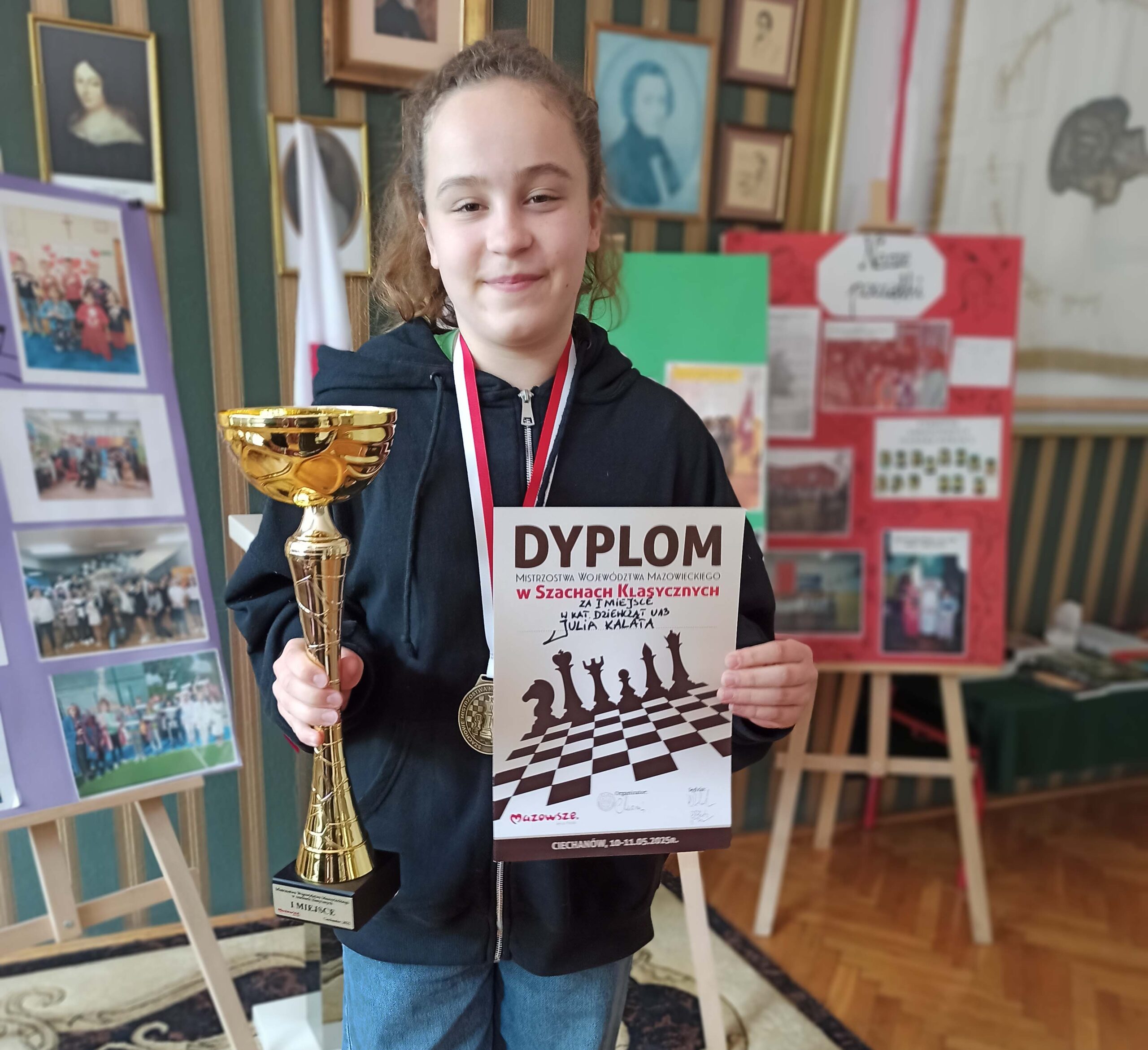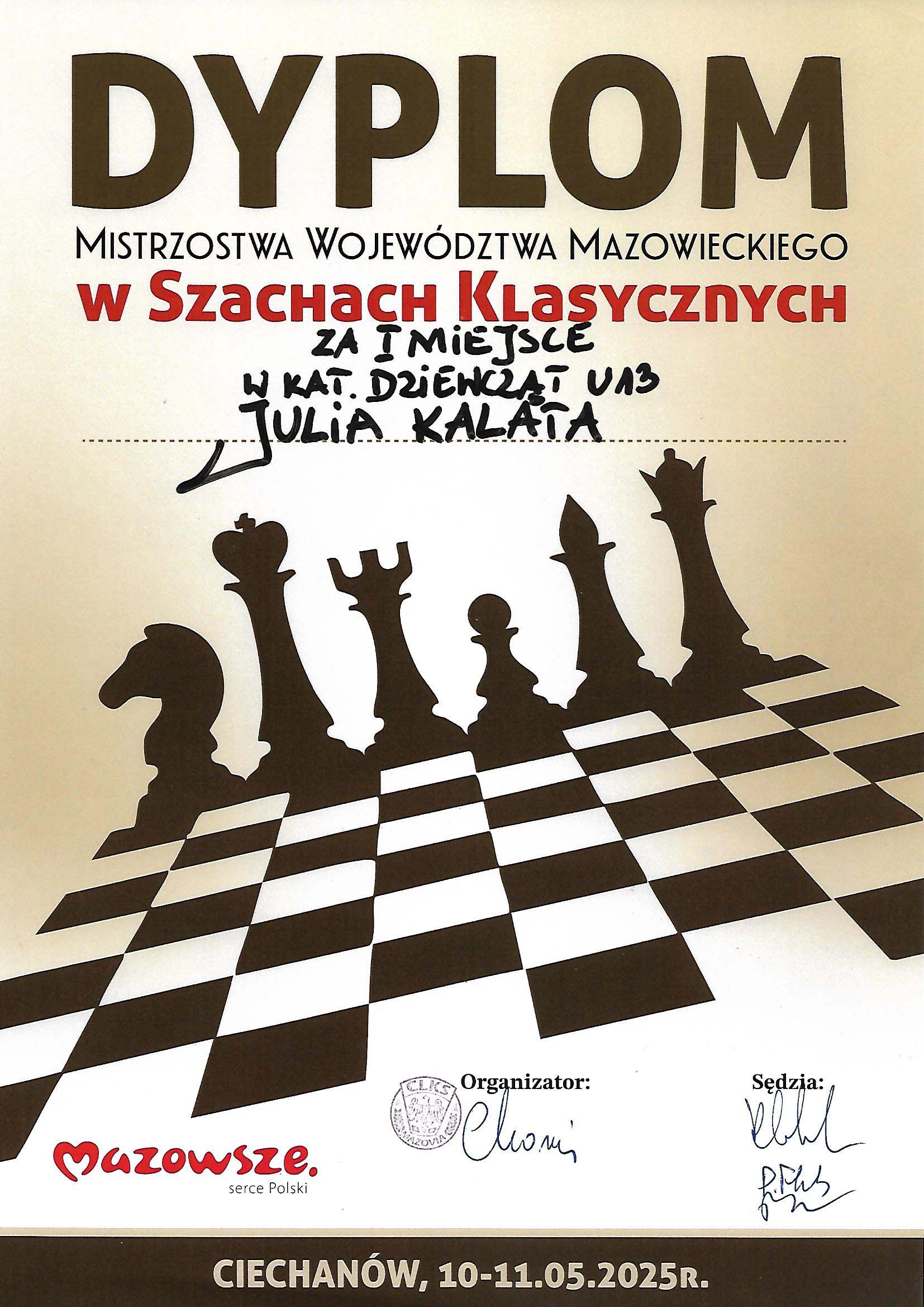 Z ogromną dumą i radością informujemy, że uczennica naszej szkoły – Julia Kalata – zdobyła I miejsce w swojej kategorii wiekowej podczas Mistrzostw Województwa Mazowieckiego w Szachach Klasycznych, uzyskując tytuł Mistrzyni Mazowsza 2025!