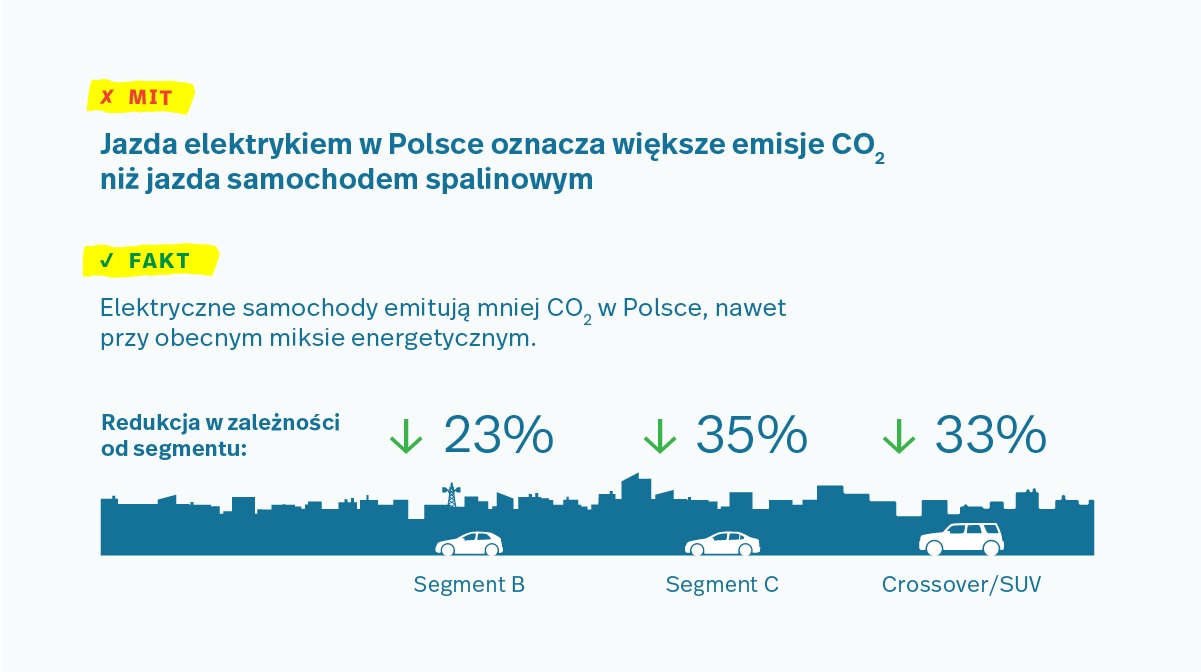 „Elektryk jest gorszy dla środowiska od samochodu spalinowego” – to jeden z najbardziej rozpowszechnionych mitów. W Polsce większość energii nadal produkujemy w oparciu o węgiel, dlatego wiele osób twierdzi, że jazda na prąd wygeneruje większy ślad węglowy (emisje CO2). Prawda jest inna, dzisiaj auto elektryczne w Polsce generuje nawet o 1/3 mniej CO2 w trakcie eksploatacji od auta spalinowego, jest też lepszy dla klimatu także od hybryd. Ale kluczowe jest zbadanie całego cyklu życia – a więc emisji związanych z produkcją, użytkowaniem oraz utylizacją. Przy założeniu, że samochód elektryczny i spalinowy jest eksploatowany przez 15 lat (to średnia wieku aut w Polsce) i przejeżdża w tym czasie 150 tys. km, to emisje CO2 z samochodu elektrycznego eksploatowanego nawet w Polsce są znacznie mniejsze od samochodu spalinowego.